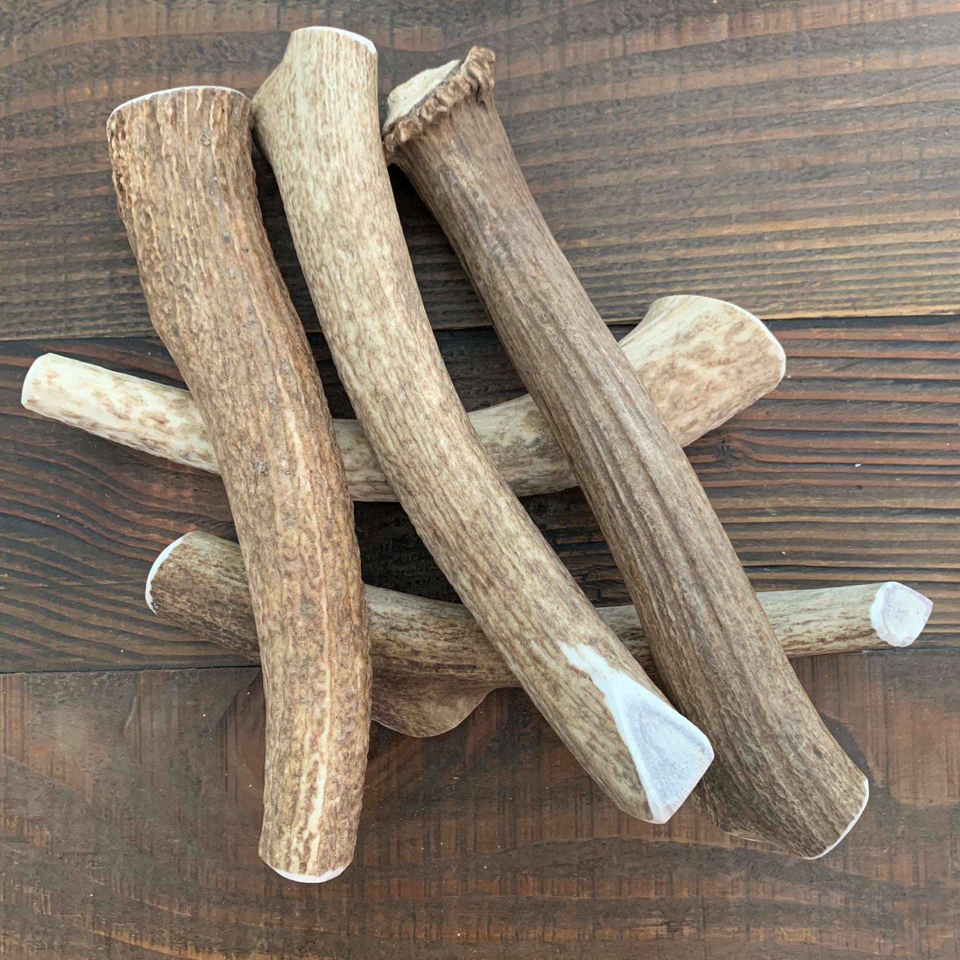 Whole Elk Antlers - These are great for harder chewing dogs that already enjoy antler chews since the marrow is not exposed other than on the cut ends. These antlers are a bigger challenge for your pup and will last much longer. Whole elk antler chews vary in density depending on where they come from. Pieces closer to the base of the antler are very dense and pose a harder chewing challenge, whereas the pieces close to the end of the antler are softer and easier to chew.