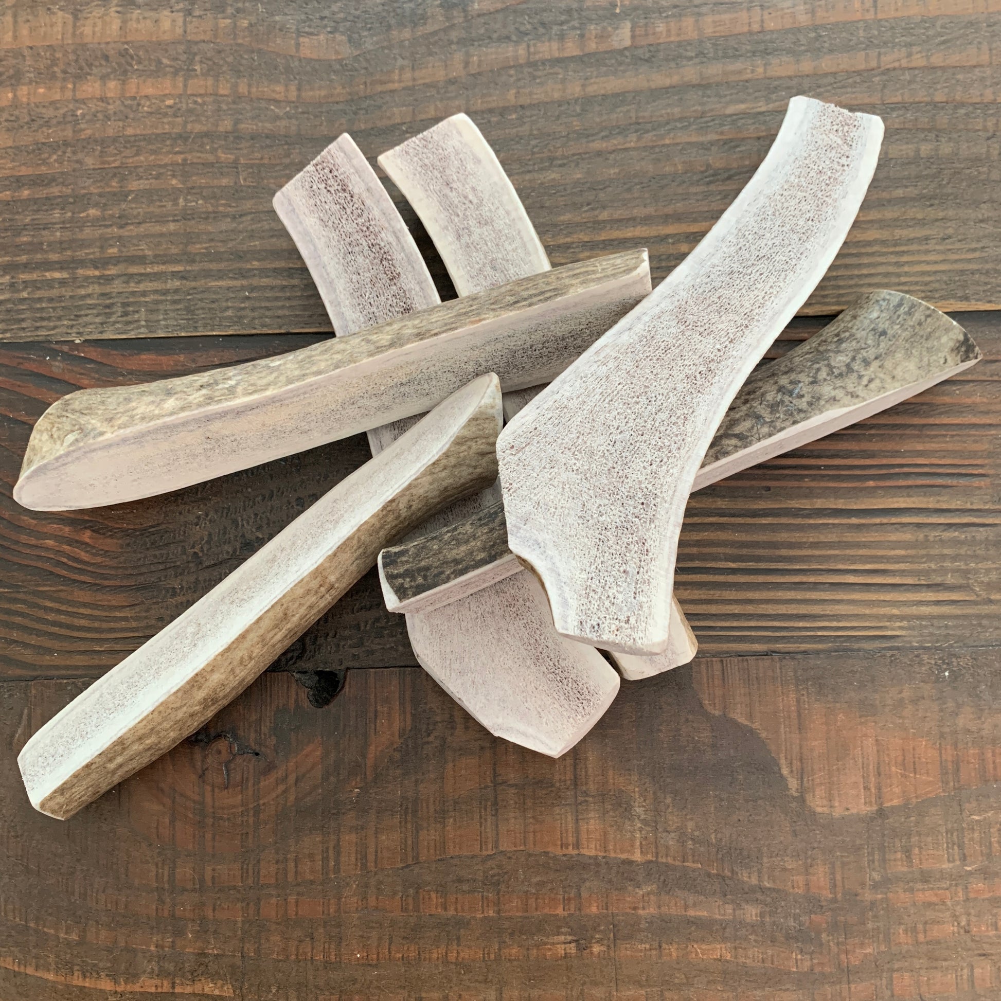 Split antlers are cut down the middle to expose the marrow. These are great for puppies, older dogs or dogs that are new to chewing antlers. These will not last very long for hard chewing dogs but are still a terrific treat.